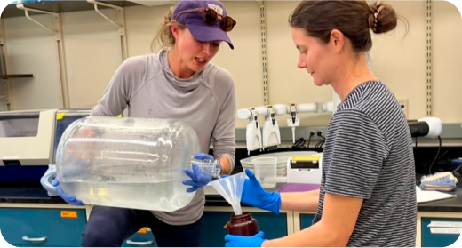 eDNA Collaborative Chief Scientist Eily Allan and Research Scientist Megan Shaffer subdividing water samples.